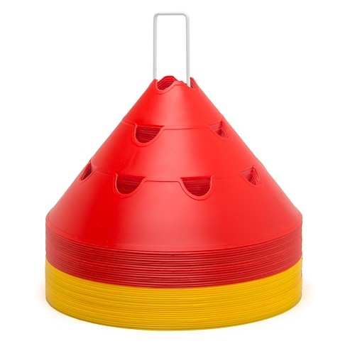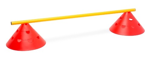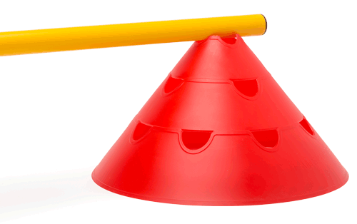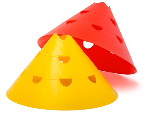 You get 20 marker perforated cones (10 red and 10 yellow each). The perforated cones are made of flexible synthetic and are therefore very durable. The marker cones are provided around with notches and can thus be combined with the matching rods (see in our shop), fastly becoming a mini-hurdles system. The price refers to 20 perforated cones incl. carrying system from metal, without hurdle rods. Teams from the professional sports also use our training equipment. The matching exercises can also be bought in our shop.