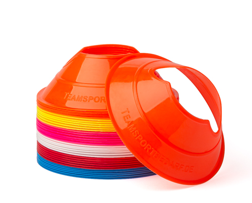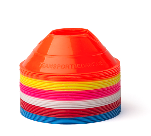You will receive a high-quality mini disc cone kit (36-Pack) - 6 colours including a carrying strap. The mini disc cones (made of flexible plastic) are very durable and flexible and have a diameter of roughly 12.5 cm each. You can use them to mark out playing fields or courses, whether on grass, artificial turf, hard courts or indoors. The mini disc cones have hollows and can therefore be quickly combined with the matching hurdle bars to form a mini hurdle system. Our mini disc cones are ideal for training dribbling and movement sequences or for cognitive training. Thanks to the carrying strap included in the set, the cones are always easy to transport. The price refers to a mini disc cone kit (36-Pack) - consisting of cones in the 6 colours red, yellow, blue, white, orange and pink, including a carrying strap. You can also purchase the matching training exercises or additional marking aids in our shop. Professional sports teams are already training with our products!