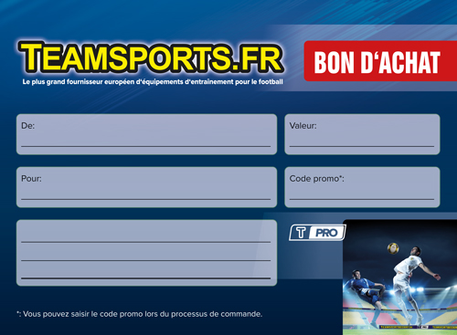 Teamsportbedarf.de Chèques-cadeaux sans attente ! Vous recevez un bon cadeau attrayant au format pdf à imprimer. Sur le chèque-cadeau se trouve un code que le "bénéficiaire" peut ensuite utiliser très facilement lors de ses achats dans la boutique Teamsportbedarf.de. Un cadeau idéal pour les entraîneurs, les joueurs, les coaches et les clubs.Le bon d'achat est mis à disposition dans le récapitulatif de la commande dès réception du paiement. Vous pouvez également acheterd'autres bonsou des cadeaux dans notre boutique.
