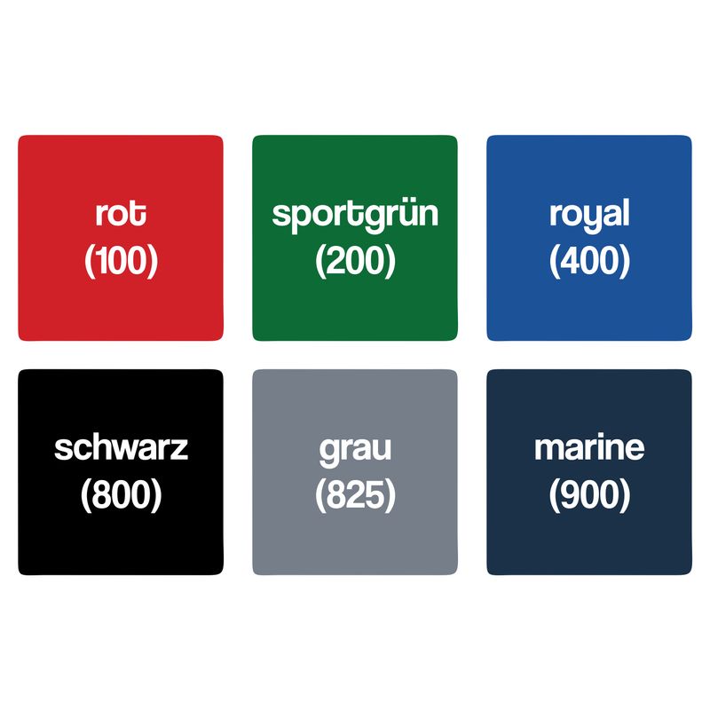 - Colours: red, sport green, royal blue, black, grey and navy