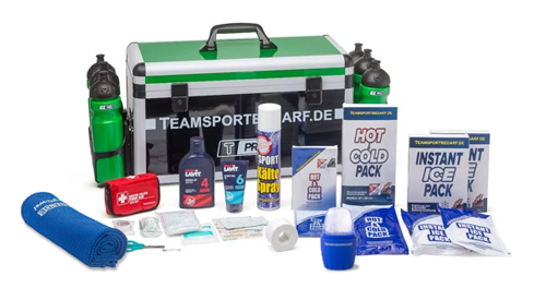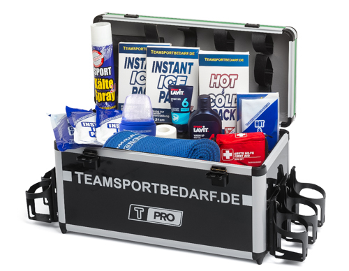 You get a high quality and sturdy T-PRO caregiver's case with sturdy metal locks (lockable), without contents. There is 1 main compartment inside the case, which can be individually divided by partially cushioned removable partitions. Thanks to the integrated folding cover, additional caregiver equipment can be arranged in order. The special features of this caregiver's case are the 6 side-mounted and interchangeable drinking bottles (not included in delivery). The brackets can be dismantled or mounted easily and quickly by means of a rotary lock. The additional pockets and the convenient brackets in the case cover make sure that all the care equipment can be stored clearly and securely. The case is very high quality made of aluminium and offers a volume capacity of approx. 53 litres. It has dimensions of 70 x 25 x 30 cm (LxWxH) and is delivered with contents, but without drinking bottles. The drinking bottles, corresponding refill sets and other cases can also be found in our store. Even trainers from professional sports work with our products!