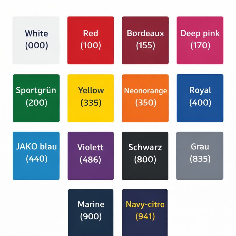 - Colours: white, red, bordeau, deep pink, sporty green, yellow, neon orange, royal blue, JAKO blue, violet, black, grey, navy blue, navy-citro